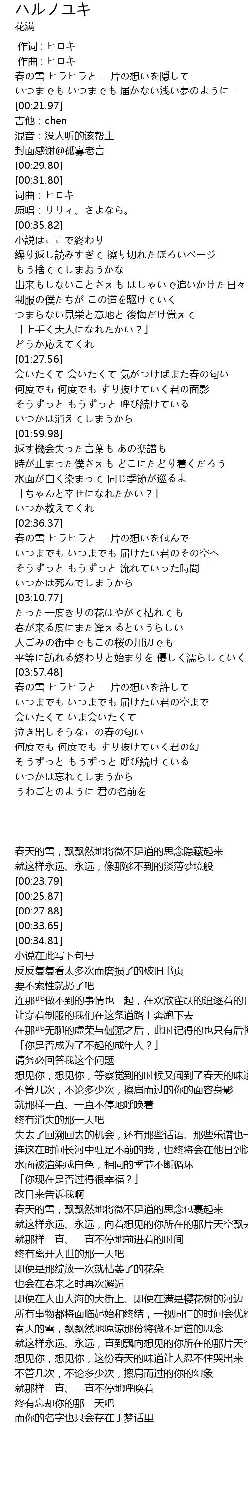 | [00:00.00] | 春天的雪,飘飘然地将微不足道的思念隐藏起来 |
