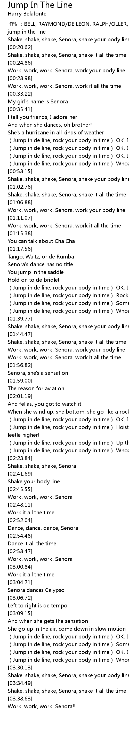 | [02:10.93] | (Jump in de line, rock your body in time) Hoist those skirts a leetle higher! |