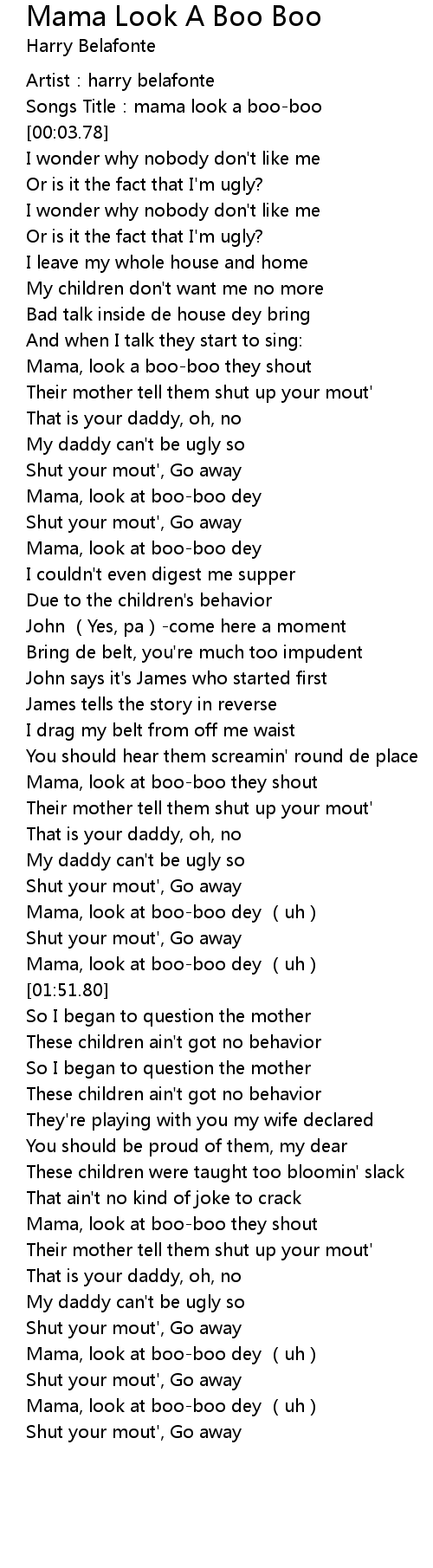| [00:44.60] | Mama, look at boo-boo dey |