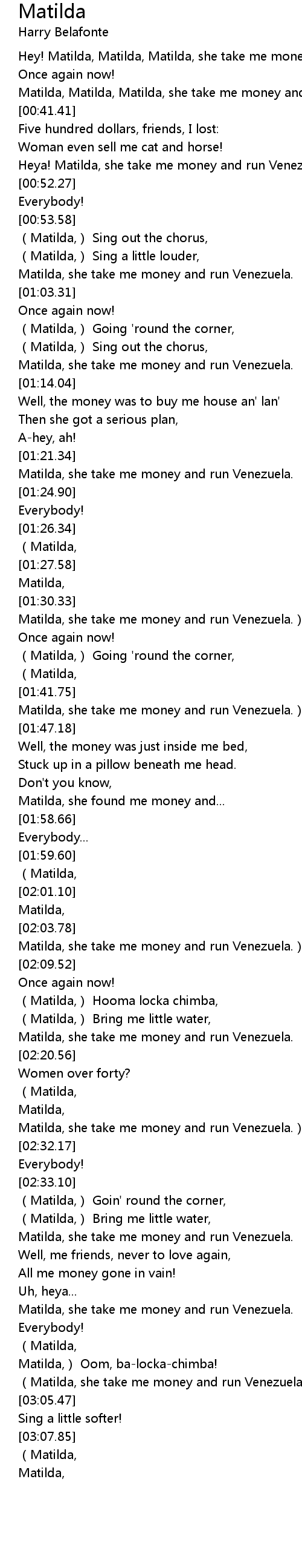 | [00:32.92] | Matilda, Matilda, Matilda, she take me money and run Venezuela. |
