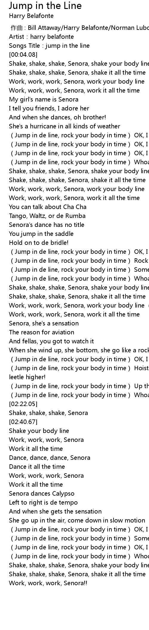 | [02:09.06] | Jump in de line, rock your body in time Hoist those skirts a leetle higher! |