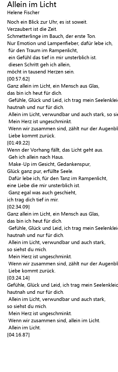 | [04:04.36] | Wenn wir zusammen sind, allein im Licht. |
