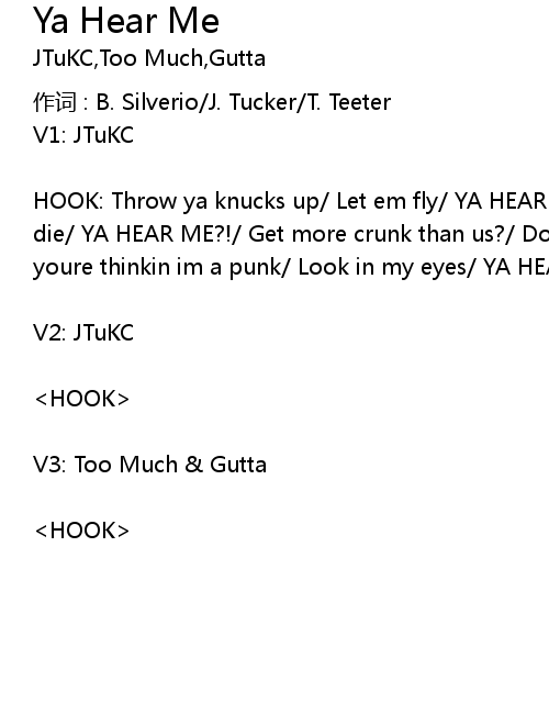 | HOOK: Throw ya knucks up/ Let em fly/ YA HEAR ME?!/ Makin' trunks bump/ Till we die/ YA HEAR ME?!/ Get more crunk than us?/ Dont even try/ YA HEAR ME?!/ And if youre thinkin im a punk/ Look in my eyes/ YA HEAR ME?! | |