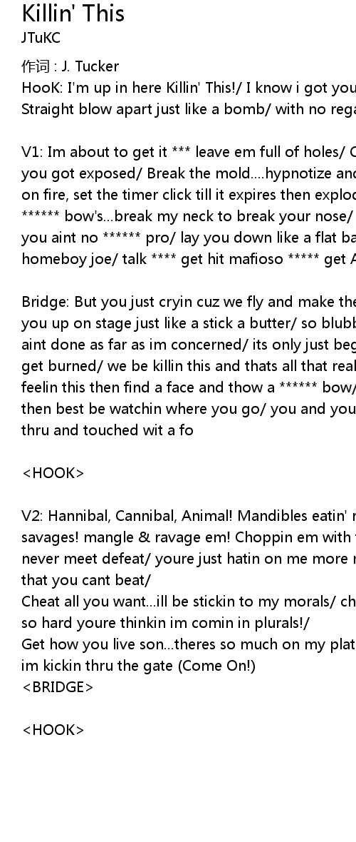 | HooK: I'm up in here Killin' This!/ I know i got you really feelin' this/ Straight blow apart just like a bomb/ with no regard! Ive just begun! | |