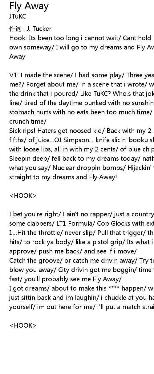 | Hook: Its been too long i cannot wait/ Cant hold me back i will make it on my own someway/ I will go to my dreams and Fly Away/ I will go to my dreams and Fly Away | |