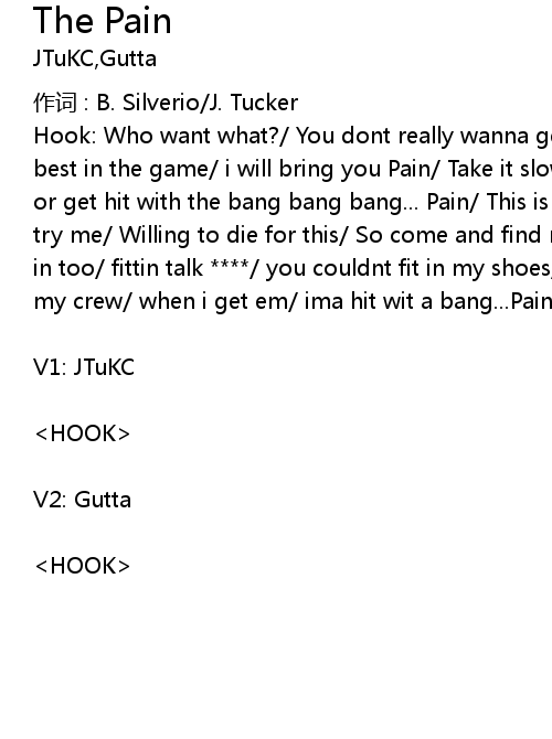 | Hook: Who want what?/ You dont really wanna get in the middle of this/ Im the best in the game/ i will bring you Pain/ Take it slow/ slow your role lil homie/ or get hit with the bang bang bang... Pain/ This is my livelihood/ so come and try me/ Willing to die for this/ So come and find me/ dont know what your gettin in too/ fittin talk ****/ you couldnt fit in my shoes/ sick of dudes belittlin my crew/ when i get em/ ima hit wit a bang...Pain! | |