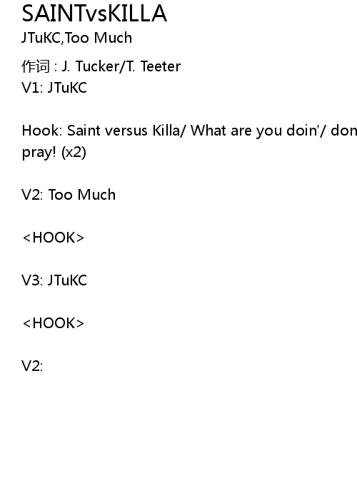 | Hook: Saint versus Killa What are you doin' dont ruin just take a breath and pray! x2 | |