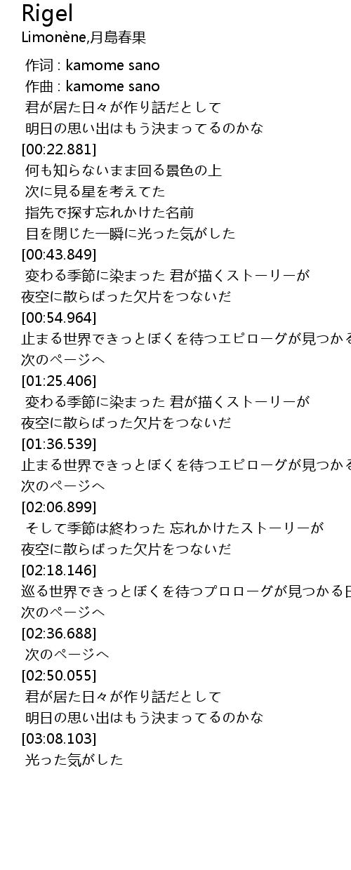 | [01:36.539] | 止まる世界できっとぼくを待つエピローグが見つかる日まで 次のページへ |