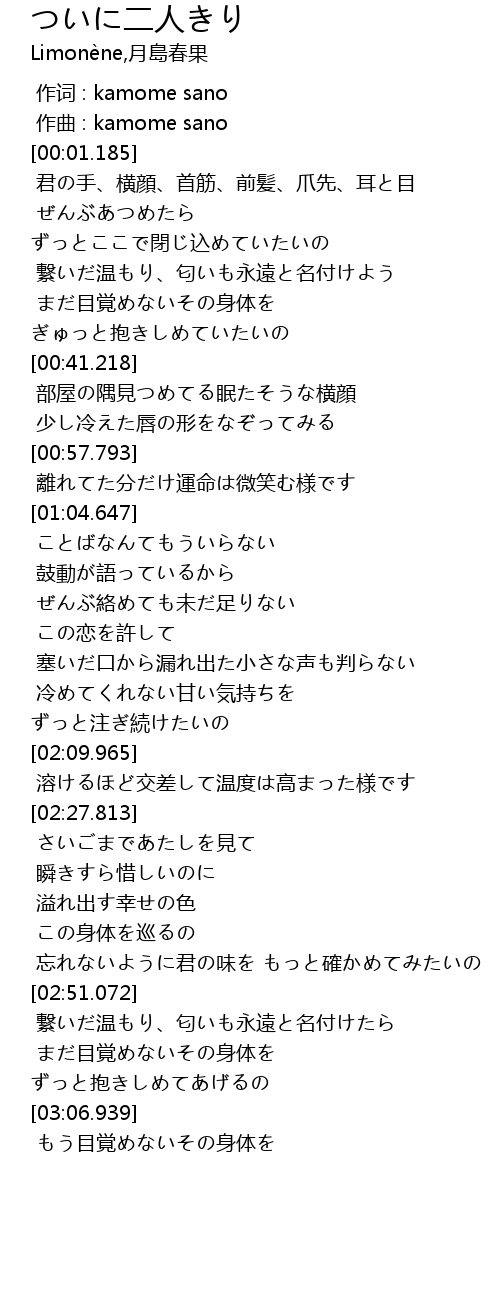 | [02:59.071] | まだ目覚めないその身体を ずっと抱きしめてあげるの |