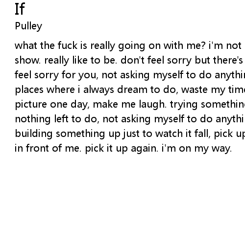 what the fuck is really going on with me? i'm not a creature in a circus freak show. really like to be. don't feel sorry but there's always pity here. don't feel sorry for you, not asking myself to do anything, anything for me. going places where i always dream to do, waste my time with that. brighten up this picture one day, make me laugh. trying something that has not been done before, nothing left to do, not asking myself to do anything. what if once i started building something up just to watch it fall, pick up again. see the pieces right in front of me. pick it up again. i'm on my way.