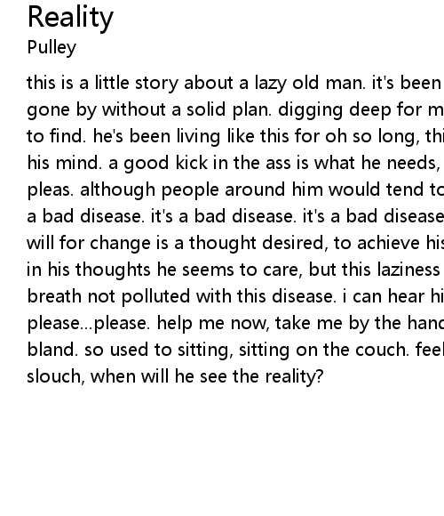 this is a little story about a lazy old man. it's been years and years and years gone by without a solid plan. digging deep for motivation, why it seems so hard to find. he's been living like this for oh so long, this way of life stuck in his mind. a good kick in the ass is what he needs, no one hears his silent pleas. although people around him would tend to agree, a life of living this is a bad disease. it's a bad disease. it's a bad disease. it's a bad disease. a will for change is a thought desired, to achieve his goals to take him higher. in his thoughts he seems to care, but this laziness lingers in the airs. a fresh breath not polluted with this disease. i can hear him screaming saying please... please...please. help me now, take me by the hand. this rut i'm in, makes me so bland. so used to sitting, sitting on the couch. feeling like a fucking goddamn slouch, when will he see the reality?
