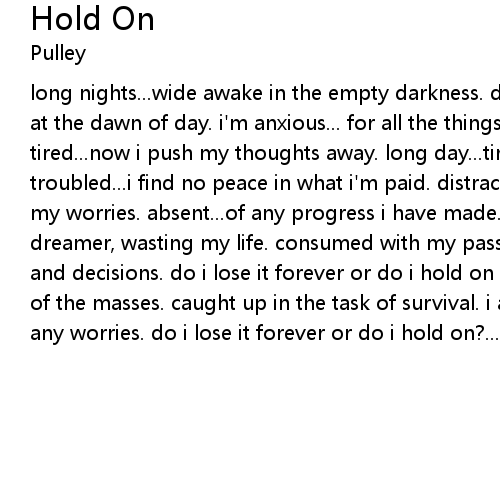long nights...wide awake in the empty darkness. dreading... the alarm that waits at the dawn of day. i'm anxious... for all the things that i want from life. i'm tired...now i push my thoughts away. long day...tired and sore, abused my body, troubled...i find no peace in what i'm paid. distracted...the tv takes me from my worries. absent...of any progress i have made. i am nothing more than a dreamer, wasting my life. consumed with my passion, caught in a world of debts and decisions. do i lose it forever or do i hold on i am no different, just one of the masses. caught up in the task of survival. i am waiting on days without any worries. do i lose it forever or do i hold on?...to my dreams. |