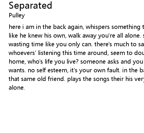 here i am in the back again, whispers something to a friend. plays the songs like he knew his own, walk away you're all alone. separated it's hard for you, wasting time like you only can. there's much to say, here you are again. whoevers' listening this time around, seem to doubt about your sound. what's at home, who's life you live? someone asks and you never give. what you have nobody wants. no self esteem, it's your own fault. in the back again, whispering to that same old friend. plays the songs their his very own. walk away you're still alone.