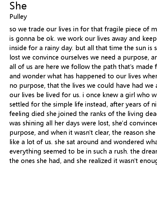 so we trade our lives in for that fragile piece of mind that tells us everything is gonna be ok. we work our lives away and keep our savings saved, and wait inside for a rainy day. but all that time the sun is shining. all those days are lost we convince ourselves we need a purpose, and when it's not too clear why all of us are here we follow the path that's made for us. and we'll sit around and wonder what has happened to our lives when we realize that our purpose has no purpose, that the lives we could have had we all left for dead when we let our lives be lived for us. i once knew a girl who wanted all the world but she settled for the simple life instead, after years of nine-to-five, that yearning feeling died she joined the ranks of the living dead. and all that time the sun was shining all her days were lost, she'd convinced herself she'd need a purpose, and when it wasn't clear, the reason she was here she followed just like a lot of us. she sat around and wondered what had happened to her life, everything seemed to be in such a rush. the dreams she could have had were not the ones she had, and she realized it wasn't enough. |