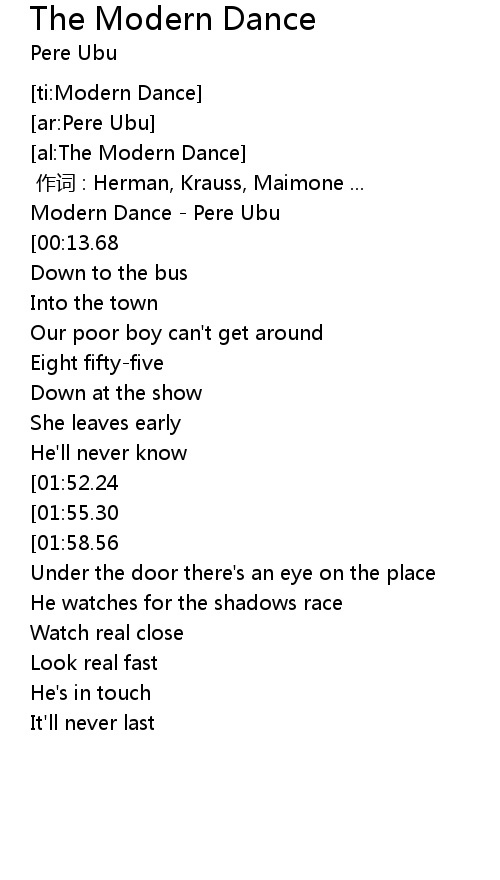 | [00:00.54] | Modern Dance - Pere Ubu |