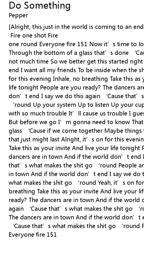 | Alright, this just in the world is coming to an end. The entire population is exploding each other one by one. Thank you, and good night. Fire one shot Fire one round Everyone fire 151 Now it' s time to look at the end of the world Through the bottom of a glass that' s done ' Cause I realize that there' s not much time So we better get this started right now ' Cause if the world does end I want all my friends To be inside when the shit goes down Yeah, it' s on for this evening Inhale, no breathing Take this as your invite And live your life tonight People are you ready? The dancers are in town And if the world don' t end I say we do this again ' Cause that' s what makes the shit go ' round Up your system Up to listen Up your cup Up until you hit the top And with so much trouble It' ll cause us trouble I guess we might as well give up But before we go I' m gonna need to know That we all went out with one last glass ' Cause if we come together Maybe things will get better And make a world that just might last Alright, it' s on for this evening Inhale, no breathing Take this as your invite And live your life tonight People are you ready? The dancers are in town And if the world don' t end I say we do this again ' Cause that' s what makes the shit go ' round People are you ready? The dancers are in town And if the world don' t end I say we do this again ' Cause that' s what makes the shit go ' round Yeah, it' s on for this evening Exhale, no breathing Take this as your invite And live your life tonight People are you ready? The dancers are in town And if the world don' t end I say we do this again ' Cause that' s what makes the shit go ' round People are you ready? The dancers are in town And if the world don' t end I say we do this again ' Cause that' s what makes the shit go ' round Fire one shot Fire one round Everyone fire 151 |