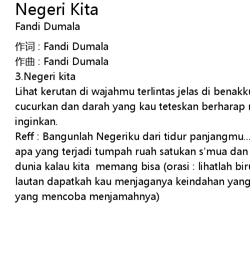| Reff : Bangunlah Negeriku dari tidur panjangmu...bukalah sejenak matamu lihat apa yang terjadi tumpah ruah satukan s'mua dan tak ada perbedaan tunjukan pada dunia kalau kita memang bisa (orasi : lihatlah birunya langit dan indahnya lautan dapatkah kau menjaganya keindahan yang s'lalu kekal dari tangan-tangan yang mencoba menjamahnya) |