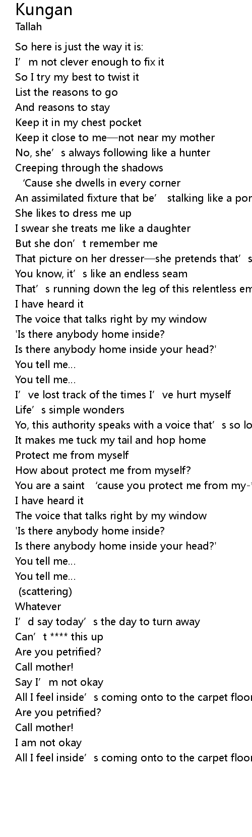 | [01:02.32] | Keep it close to me not near my mother |