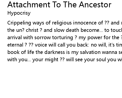 | Crippeling ways of religious innocence of ?? and now get me nacked ?? destroy the un? christ ? and slow death become... to touch ? ?? to come here seeing this arrival with sorrow torturing ? my power for the ? time has come ?? knife or the eternal ? ?? voice will call you back: no will, it's time to die read in the book of life the darkness is my salvation wanna see eternal life ? will take with you... your might ?? will see your soul you will be a ? to ? me |