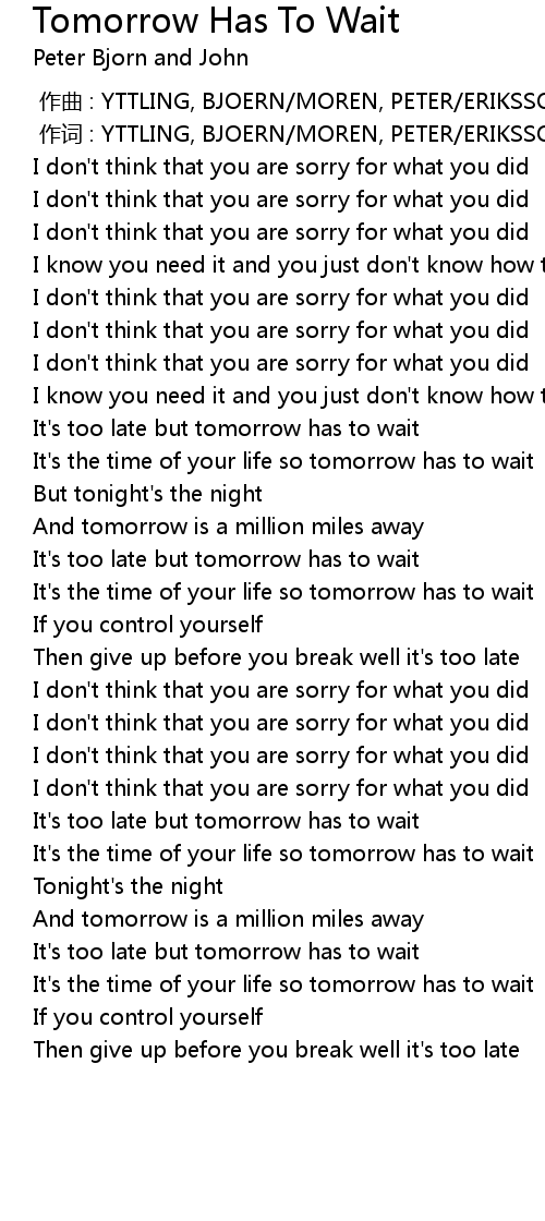 | [01:25.10] | It' s too late but tomorrow has to wait |