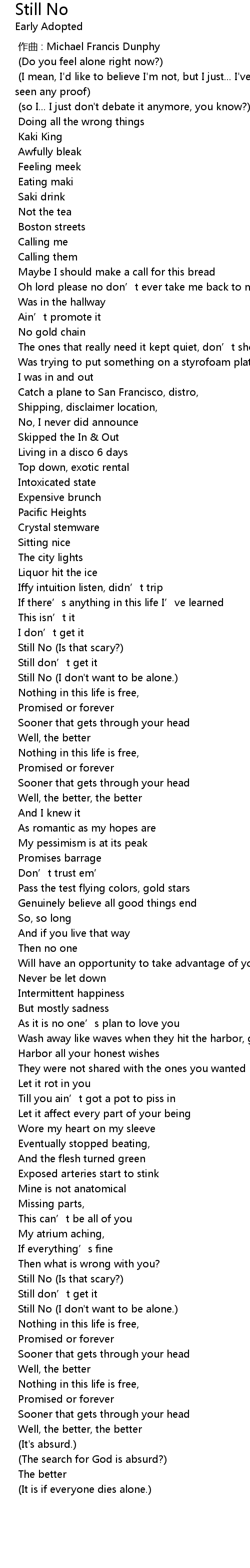 | [01:10.144] | Still No (I don't want to be alone.) |