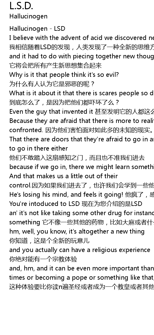 | [00:06] | I believe with the advent of acid we discovered new way to think wo xiang xin sui zhe LSD de fa xian, ren lei fa xian le yi zhong quan xin de si wei fang shi |