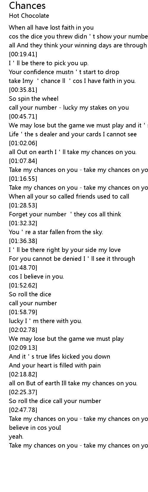 | [03:11.18] | Take my chances on you take my chances on you . . . |