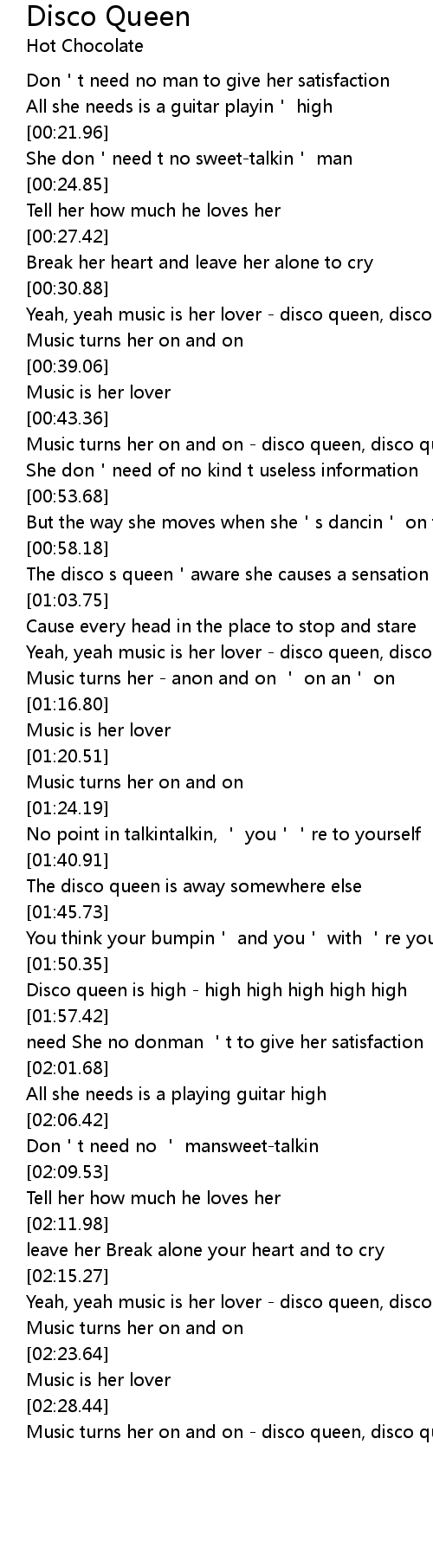 | [00:46.17] | Music turns her on and on - disco queen, disco queen |