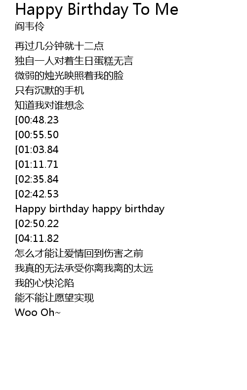 | [04:19.17][04:11.82][03:57.54][03:49.41][02:57.56] | 祝我生日快乐 |