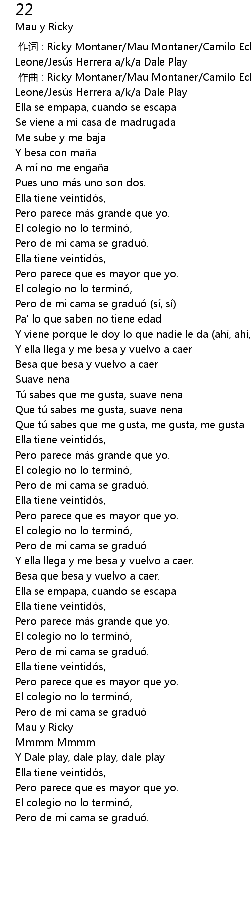 | [00:01.000] | 作曲 : Ricky Montaner/Mau Montaner/Camilo Echeverry/Jon Leone/Jesús Herrera a/k/a Dale Play |