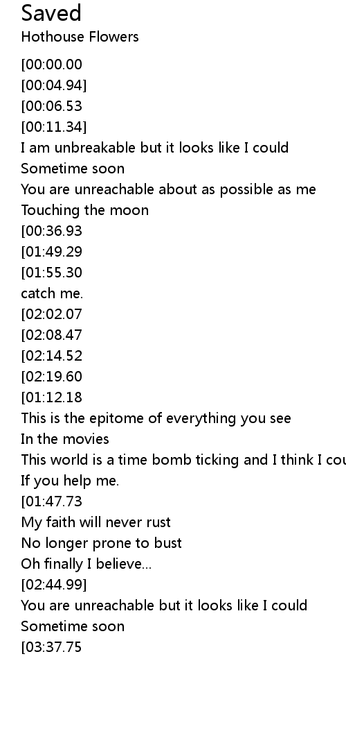 | [00:13.70] | I am unbreakable but it looks like I could |