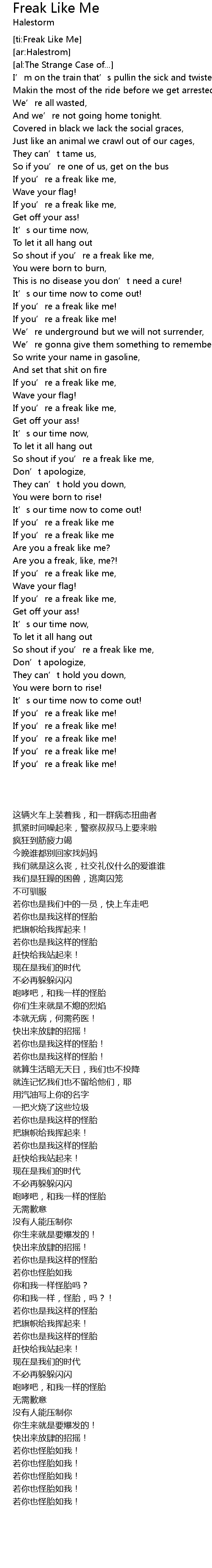 | [02:00.15] | So shout if you' re a freak like me, |