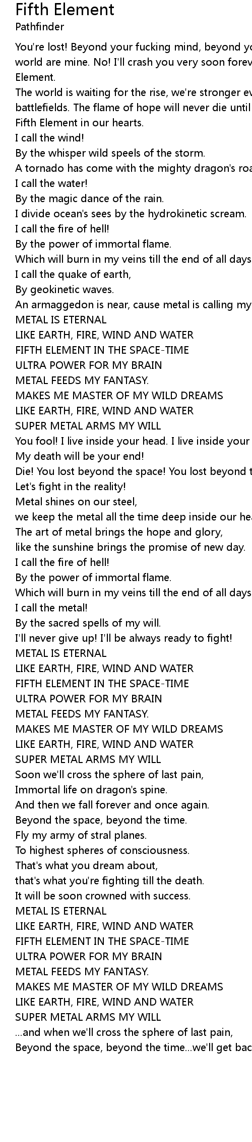 The world is waiting for the rise, we're stronger every day by the blood of all battlefields. The flame of hope will never die until we will keep the might of Fifth Element in our hearts. |