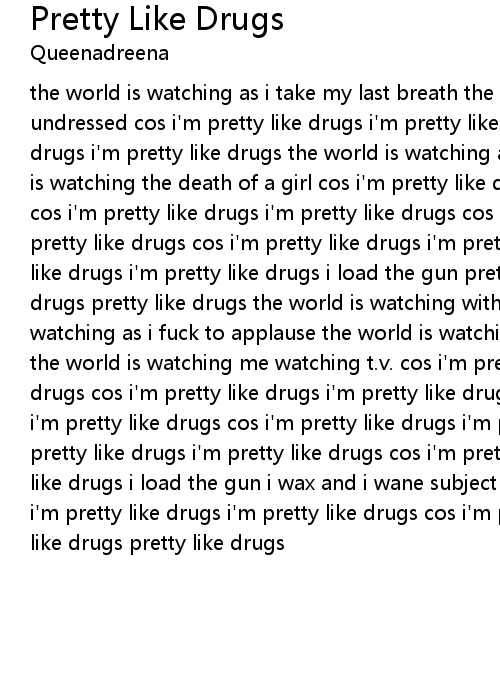 the world is watching as i take my last breath the world is watching as i get undressed cos i'm pretty like drugs i'm pretty like drugs cos i'm pretty like drugs i'm pretty like drugs the world is watching as my wings unfurl the world is watching the death of a girl cos i'm pretty like drugs i'm pretty like drugs cos i'm pretty like drugs i'm pretty like drugs cos i'm pretty like drugs i'm pretty like drugs cos i'm pretty like drugs i'm pretty like drugs cos i'm pretty like drugs i'm pretty like drugs i load the gun pretty like drugs pretty like drugs pretty like drugs the world is watching with a pregnant pause the world is watching as i fuck to applause the world is watching as i plant the last seed the world is watching me watching t.v. cos i'm pretty like drugs i'm pretty like drugs cos i'm pretty like drugs i'm pretty like drugs cos i'm pretty like drugs i'm pretty like drugs cos i'm pretty like drugs i'm pretty like drugs cos i'm pretty like drugs i'm pretty like drugs cos i'm pretty like drugs i'm pretty like drugs i load the gun i wax and i wane subject all my pain onto you, baby i'm pretty like drugs i'm pretty like drugs cos i'm pretty like drugs pretty like drugs pretty like drugs |