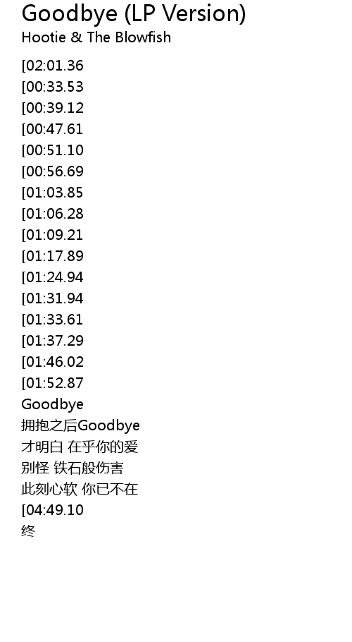 | [03:05.02][01:33.61] | yong bao zhi hou Goodbye |