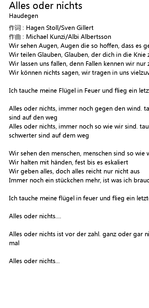 | Alles oder nichts ist vor der zahl. ganz oder gar nicht, wir fliegen ein letztes mal | |
