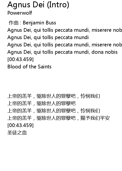 | [00:27.452] | Agnus Dei, qui tollis peccata mundi, miserere nobis |