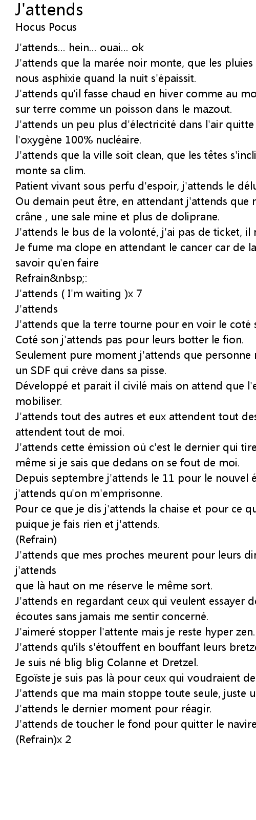 | J' attends en regardant ceux qui veulent essayer de nous gouverner, je les e coutes sans jamais me sentir concerne. | |