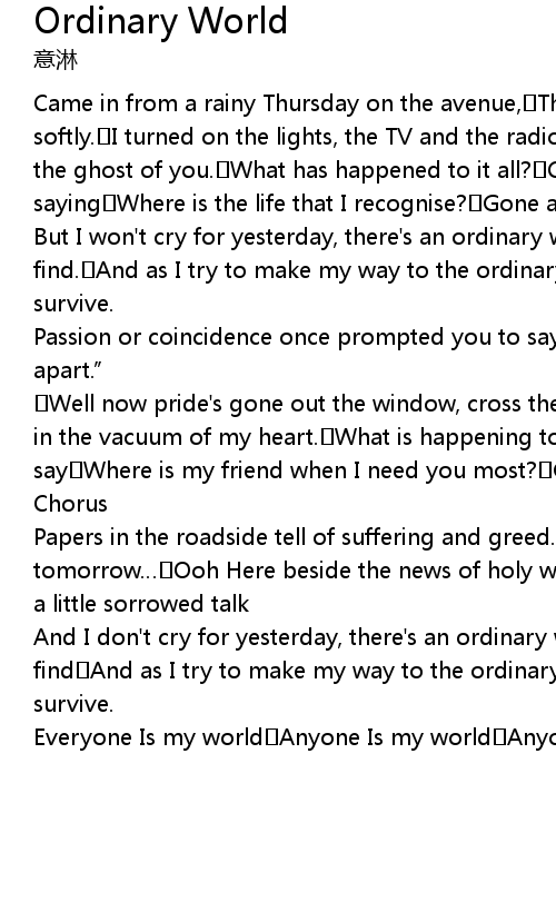 | But I won' t cry for yesterday, there' s an ordinary world, Somehow I have to find. And as I try to make my way to the ordinary world, I will learn to survive. | |