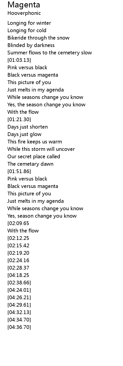 | [04:22.22][04:18.25][04:13.78][02:36.63] | ( And turn the world magenta ... ) |