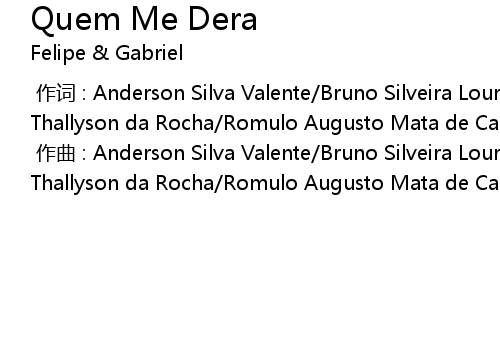 | [00:00.000] | 作曲 : Anderson Silva Valente/Bruno Silveira Lourenco/Francisco Thallyson da Rocha/Romulo Augusto Mata de Carvalho/Walber Cassio De Oliveira |