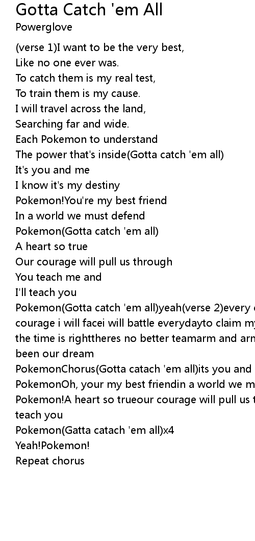 Pokemon(Gotta catch 'em all)yeah(verse 2)every challenge along the waywith courage i will facei will battle everydayto claim my rightful placecome with me the time is righttheres no better teamarm and arm well win the fightits always been our dream |