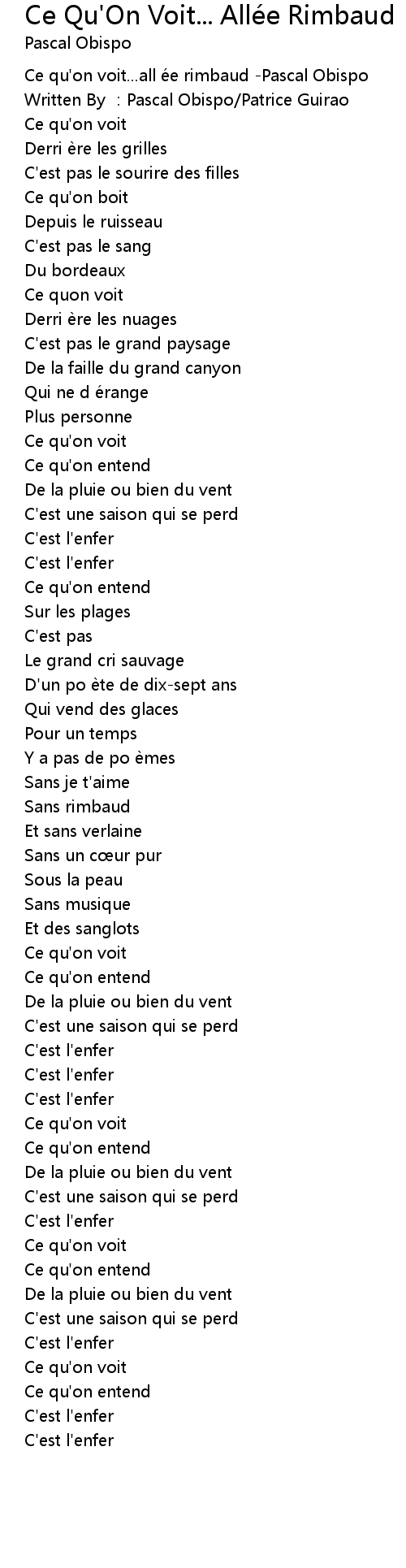 | [00:00.280] | Ce qu' on voit... all e e rimbaud Pascal Obispo |