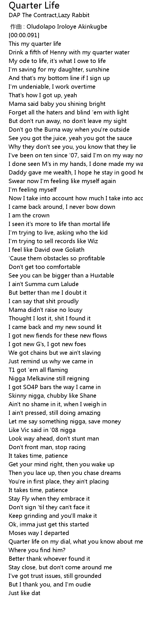 | [00:12.787] | This my quarter life |