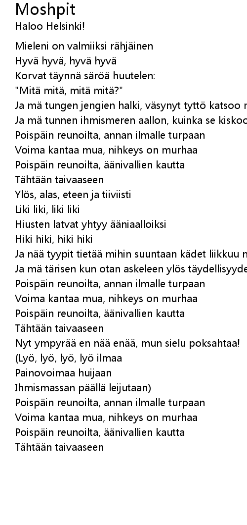| Ja m tunnen ihmismeren aallon, kuinka se kiskoo mua taas uimaan | |