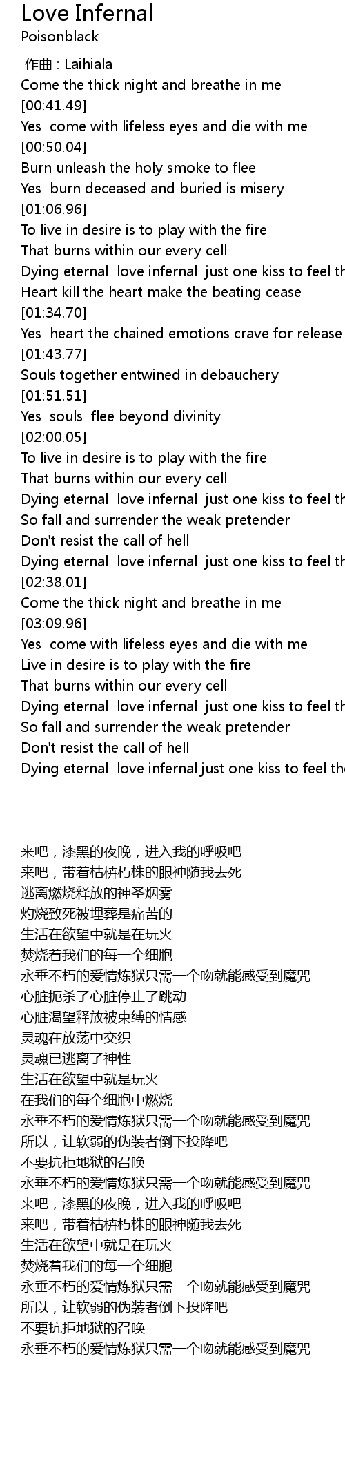 | [01:18.53] | Dying eternal love infernal just one kiss to feel the spell |