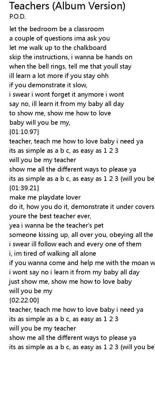 | [01:11.24] | teacher, teach me how to love baby i need ya |
