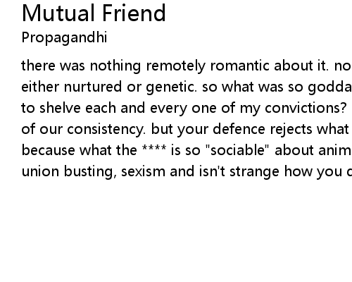 | there was nothing remotely romantic about it. no hand-me-down sob-stories, either nurtured or genetic. so what was so goddamn important that i felt i had to shelve each and every one of my convictions? secured and mutually reassured of our consistency. but your defence rejects what (you claim) you believe. because what the **** is so "sociable" about animal-confinement and torture, union busting, sexism and isn't strange how you don't call anymore? |