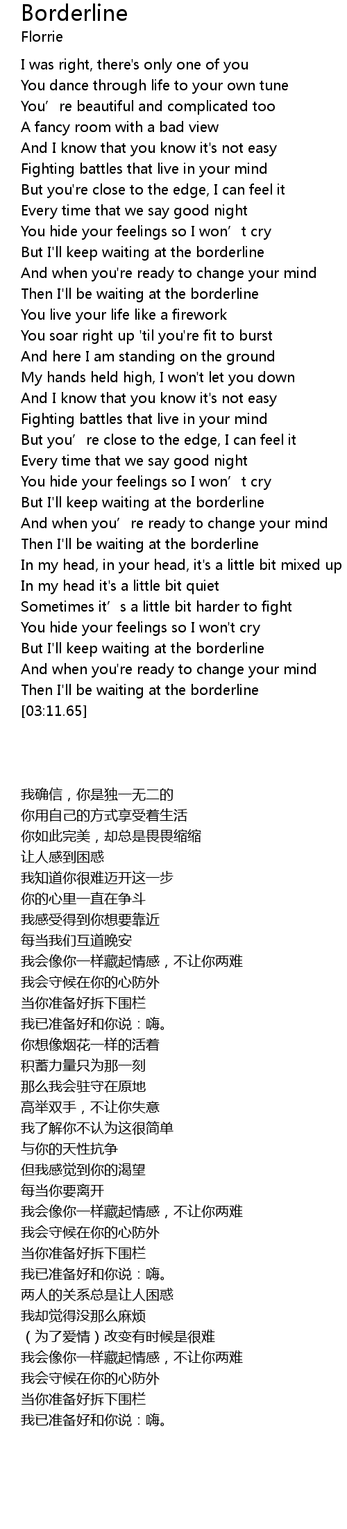 | [02:59.21] | But I' ll keep waiting at the borderline |