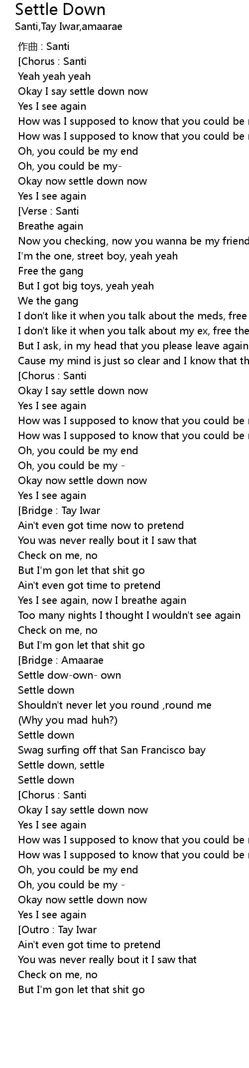 | [01:43.959] | Settle dowown own |